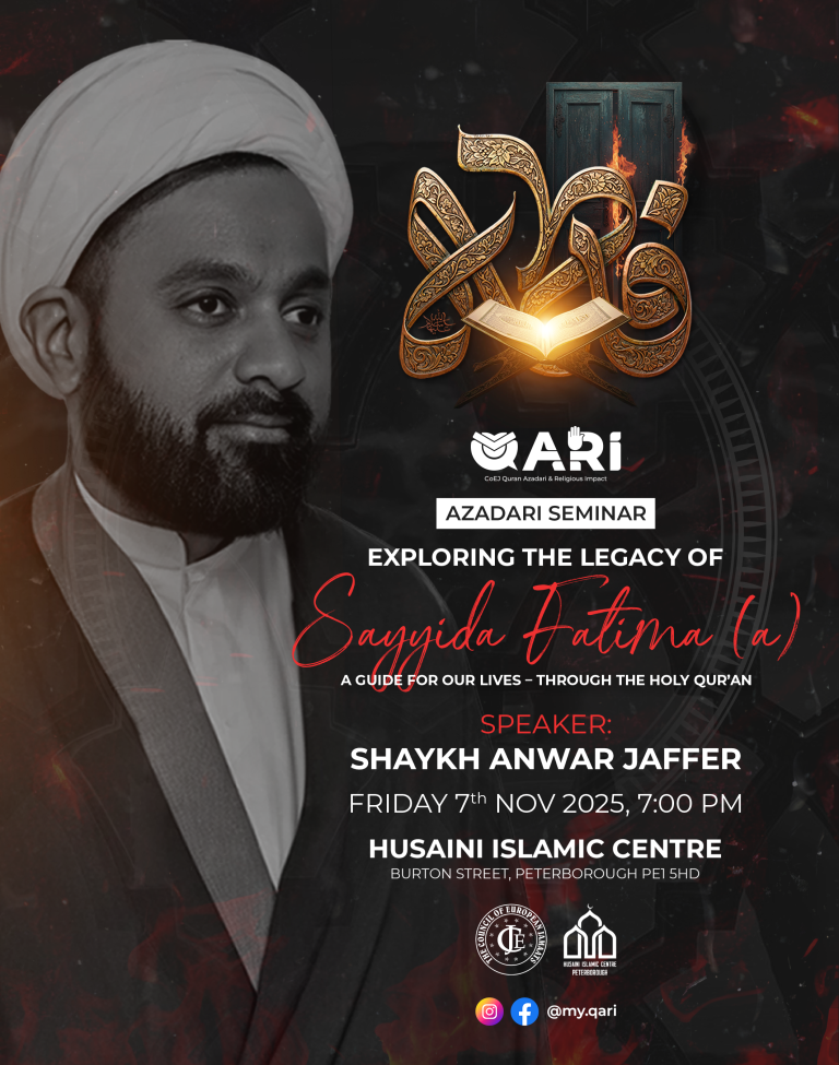 We are humbled to invite you to a deeply meaningful event: QARI’s Inaugural Azadari Seminar, Exploring the Legacy of Sayyeda Fatima (a.s): A Guide for our Lives – Through the Holy Qur’an, being held on Friday, 7th November 2025, 7pm with Nyaz, at the Husaini Islamic Centre, Burton Street, Peterborough PE1 5HD.