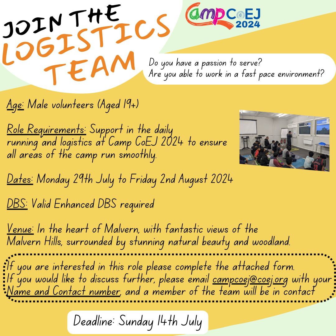 Posted on7 Jul Camp CoEJ 2024 are looking for Volunteers to support with the Logistics at Camp CoEJ 2024. Further information on the poster above. Interest Form: https://tinyurl.com/CC2024LogisticsVolunteers