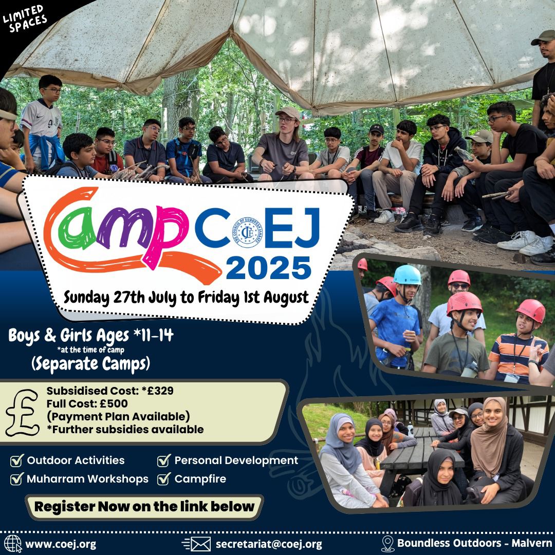 CoEJ are pleased to launch Camp CoEJ 2023 for Boys and Girls children aged 11-14. This will take place on 4th to 7th August 2023 ❗️ LIMITED SPACES ❗️ ❗️GIRLS SPACES FULL ❗️ Registration Link: Click Here