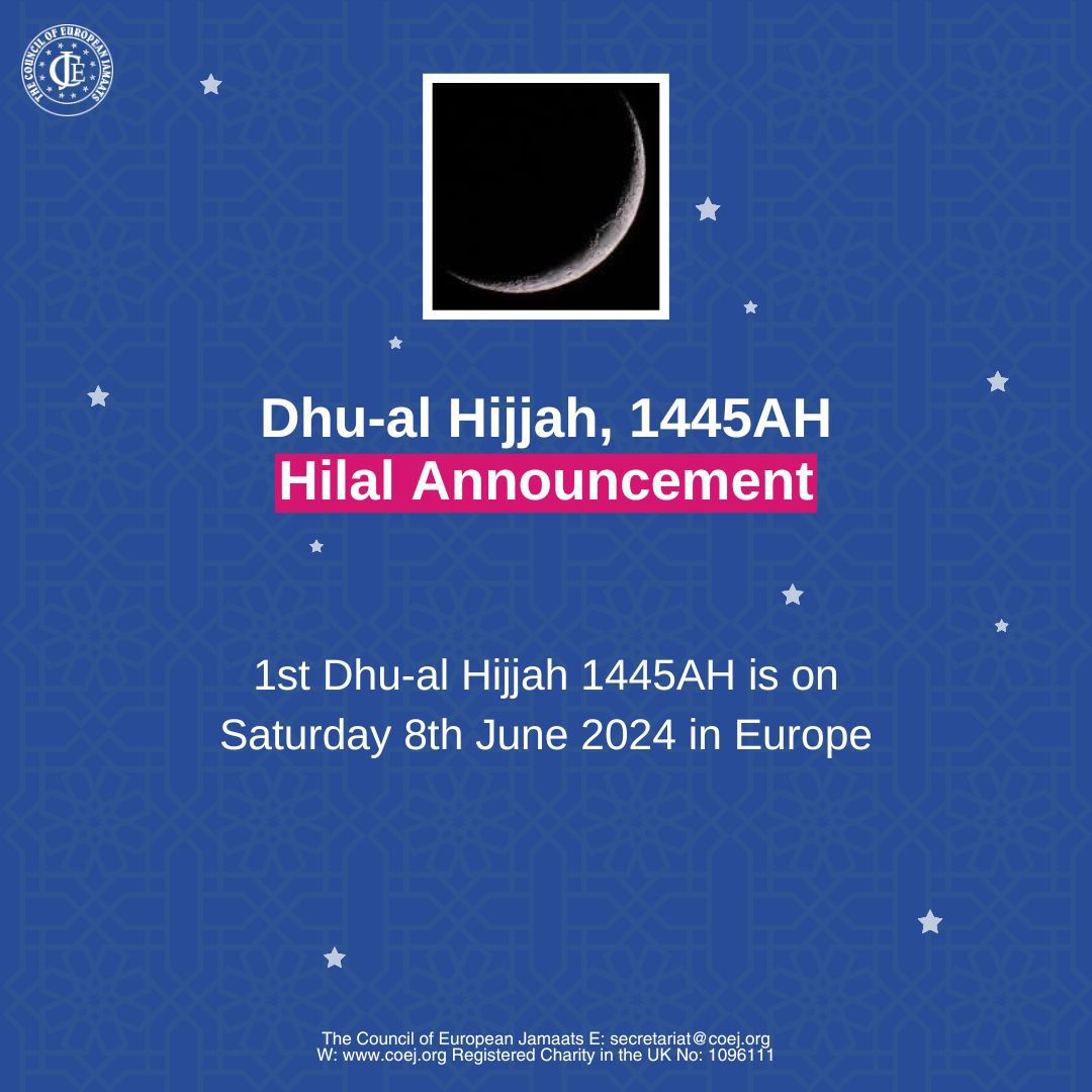1st Dhu al-Hijjah 1445AH is on Saturday 8th June 2024 in Europe