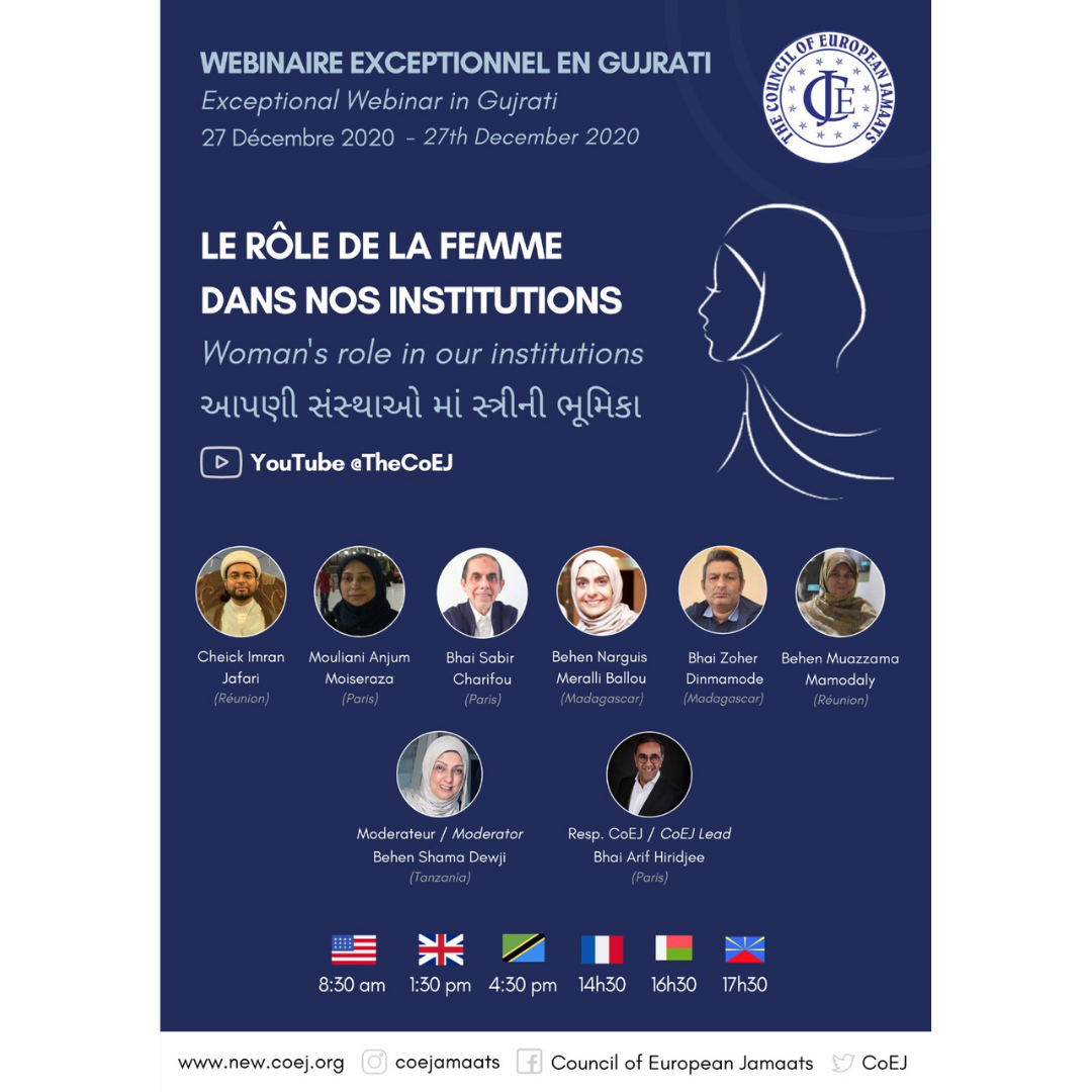 Nous organisons un webinaire exceptionnel en Gujrati sur Le Rôle de la Femme dans nos Institutions, avec des intervenants de qualité, membres de nos Jamaats.⠀
