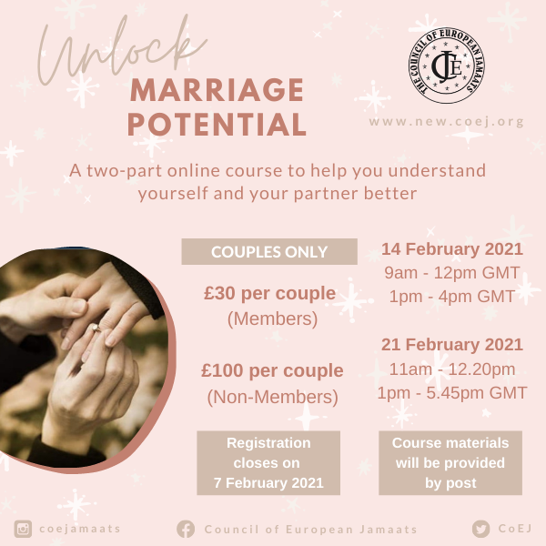 Le CoEJ a maintenant obtenu des subventions pour ce cours pour les membres de tous les Jamaats du CoEJ. Si vous êtes membre CoEJ Jamaat, vous devez maintenant payer seulement 30 £ pour ce cours, au lieu de 80 £. Si vous êtes un membre CoEJ Jamaat qui s’est inscrit à ce cours et payé 80 £, nous vous contacterons au sujet du remboursement du solde.