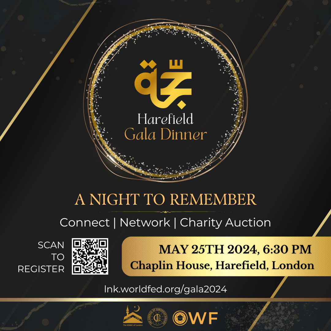 Community members are invited on Saturday, 25th May 2024 for a Gala Dinner at Hujjat Chaplin House, Harefield.