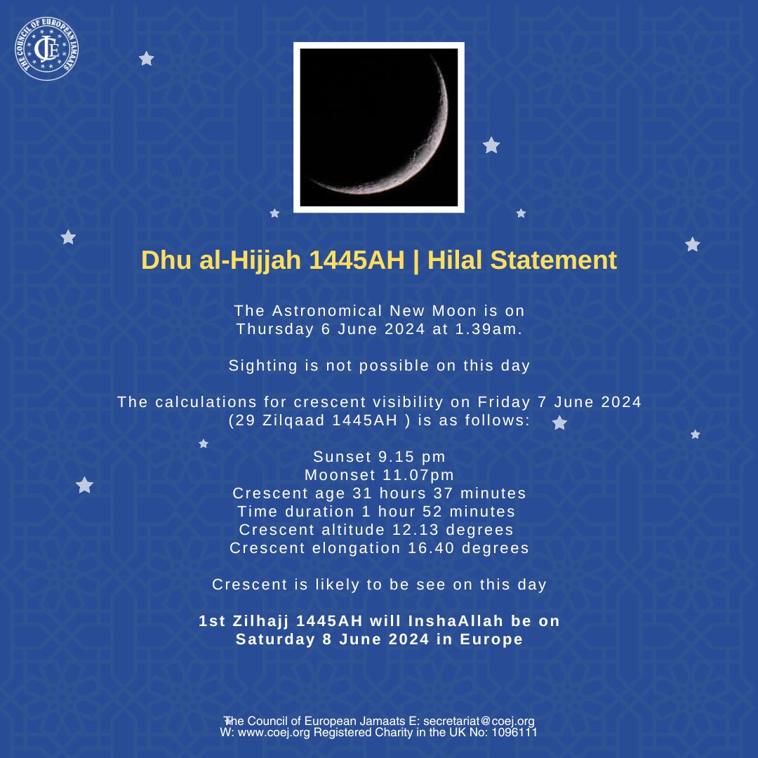 - The calculations for crescent visibility on Friday 7 June 2024 (29 Zilqaad 1445AH ) is as follows: