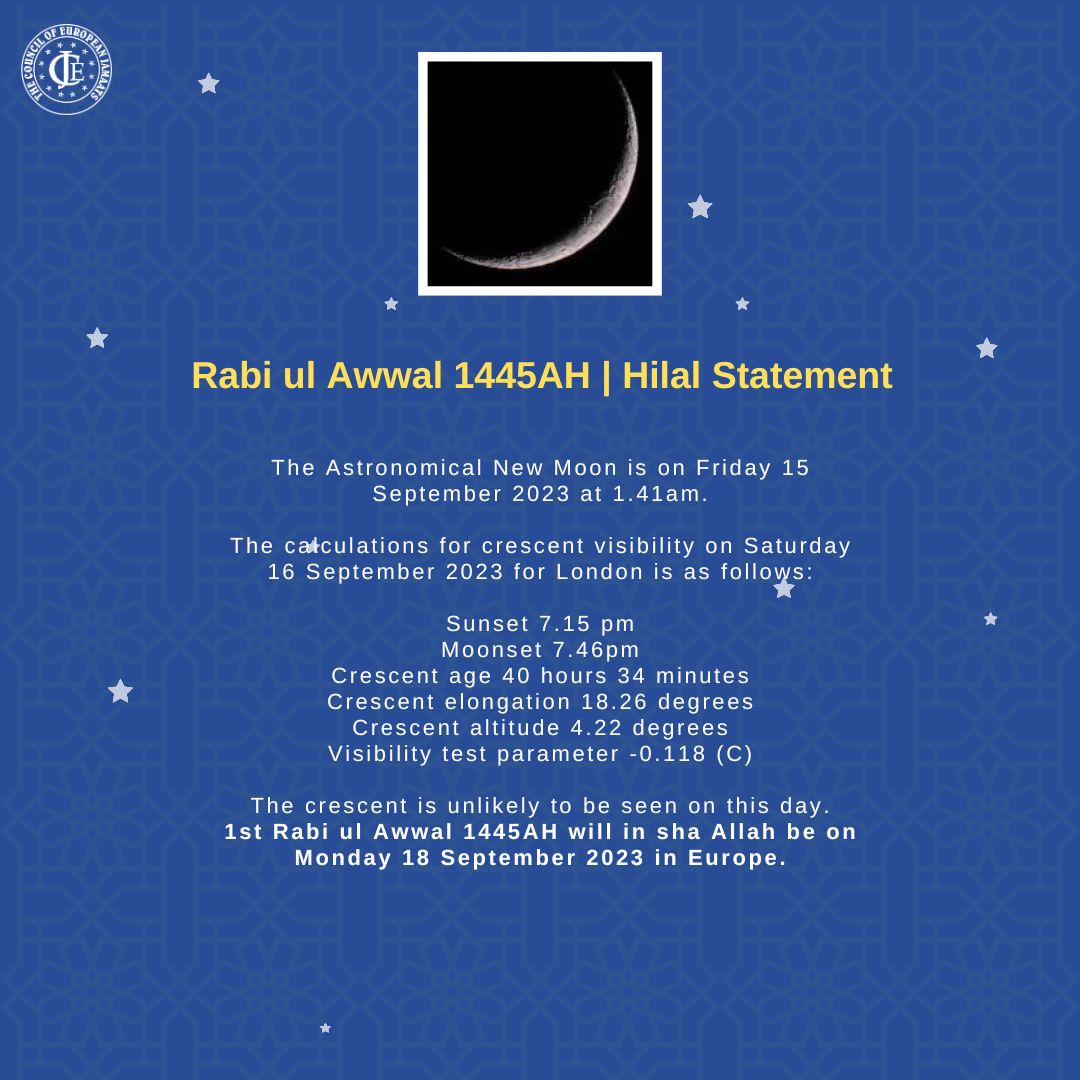 Posted on4 Sep10 December 2023 1st Rabi ul Awwal 1445AH will in sha Allah be on Monday 18 September 2023 in Europe.
