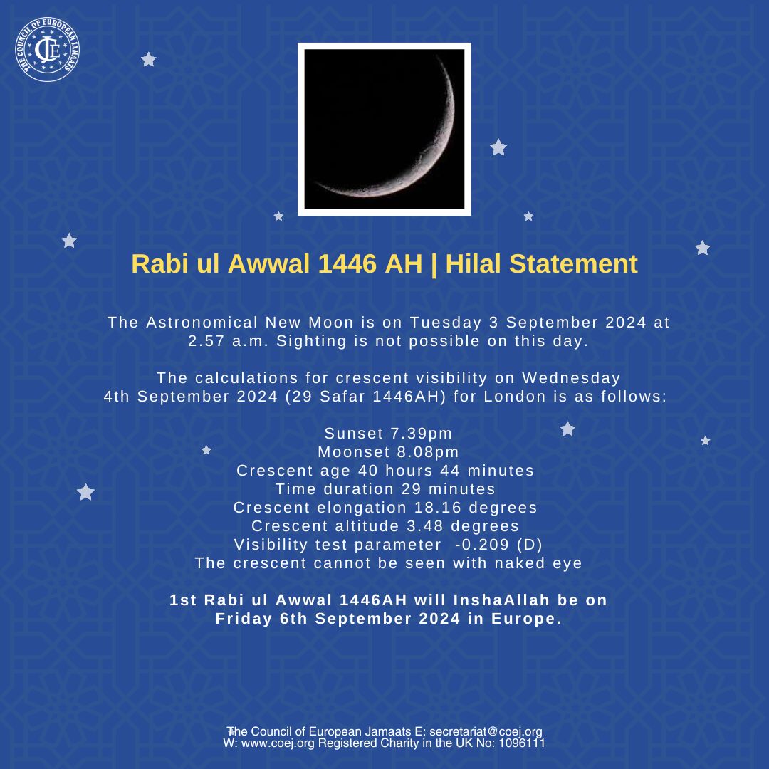 1st Rabi ul Awwal 1446AH will InshaAllah be on Friday 6th September 2024 in Europe.