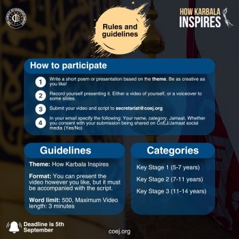 - In your email specify the following: Your name, category, Jamaat, Whether you consent with your submission being shared on CoEJ/Jamaat social media (Yes/No)