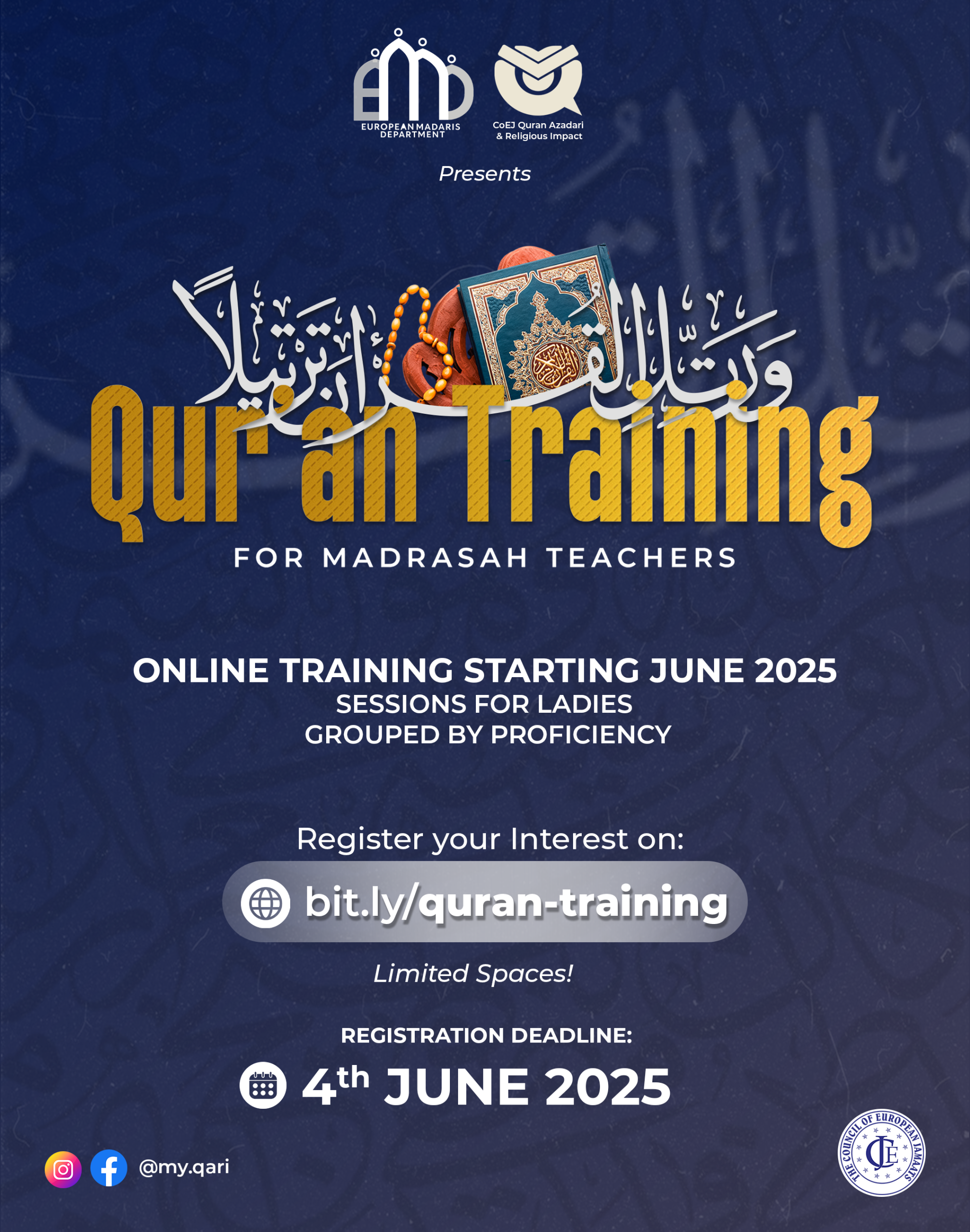 In collaboration with QARI and the European Madaris Department, we are pleased to offer a Qur’an Teacher Training programme designed to help Qur’an teachers enhance their recitation skills and teaching effectiveness.