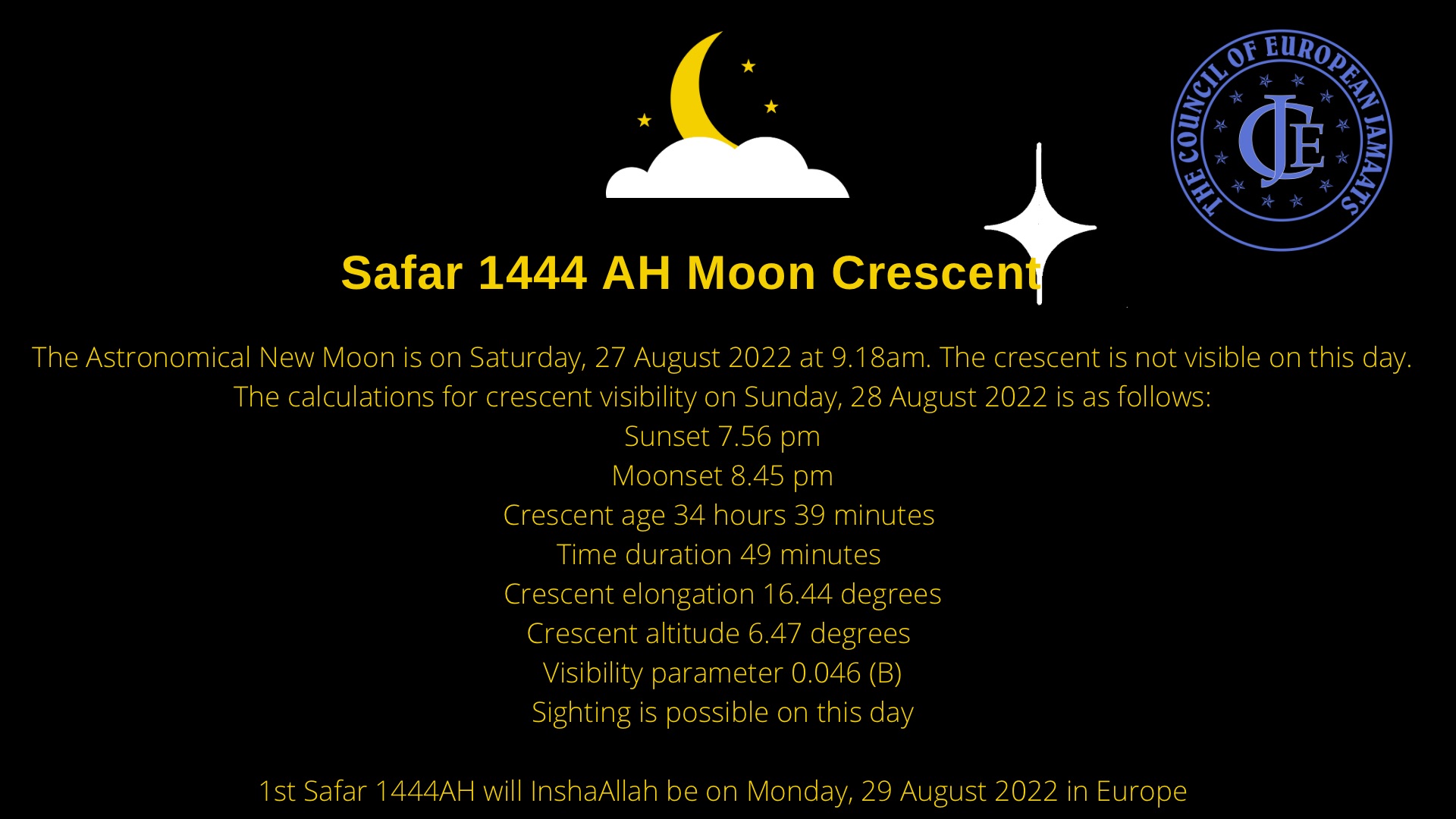 1st Safar 1444AH will InshaAllah be on Monday, 29 August 2022 in Europe.