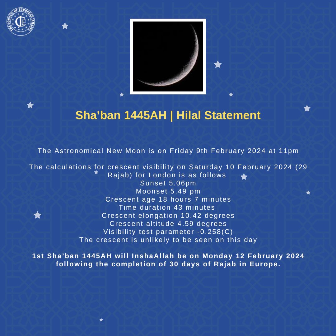 Posted on1 Feb1 February 2024 1st Sha’ban 1445AH will InshaAllah be on Monday 12 February 2024 following the completion of 30 days of Rajab in Europe.