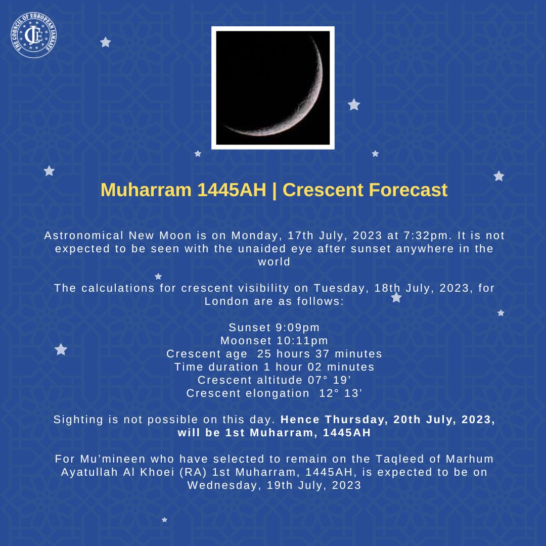 For Mu’mineen who have selected to remain on the Taqleed of Marhum Ayatullah Al Khoei (RA) 1st Muharram, 1445AH, is expected to be on Wednesday, 19th July, 2023