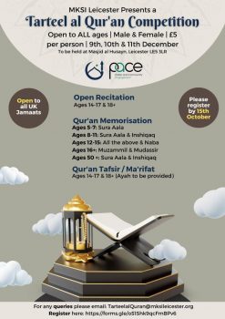 Open to all age groups male & females – to be held from 9th to 11th December 2022 at Masjidul Hussain, Leicester, UK